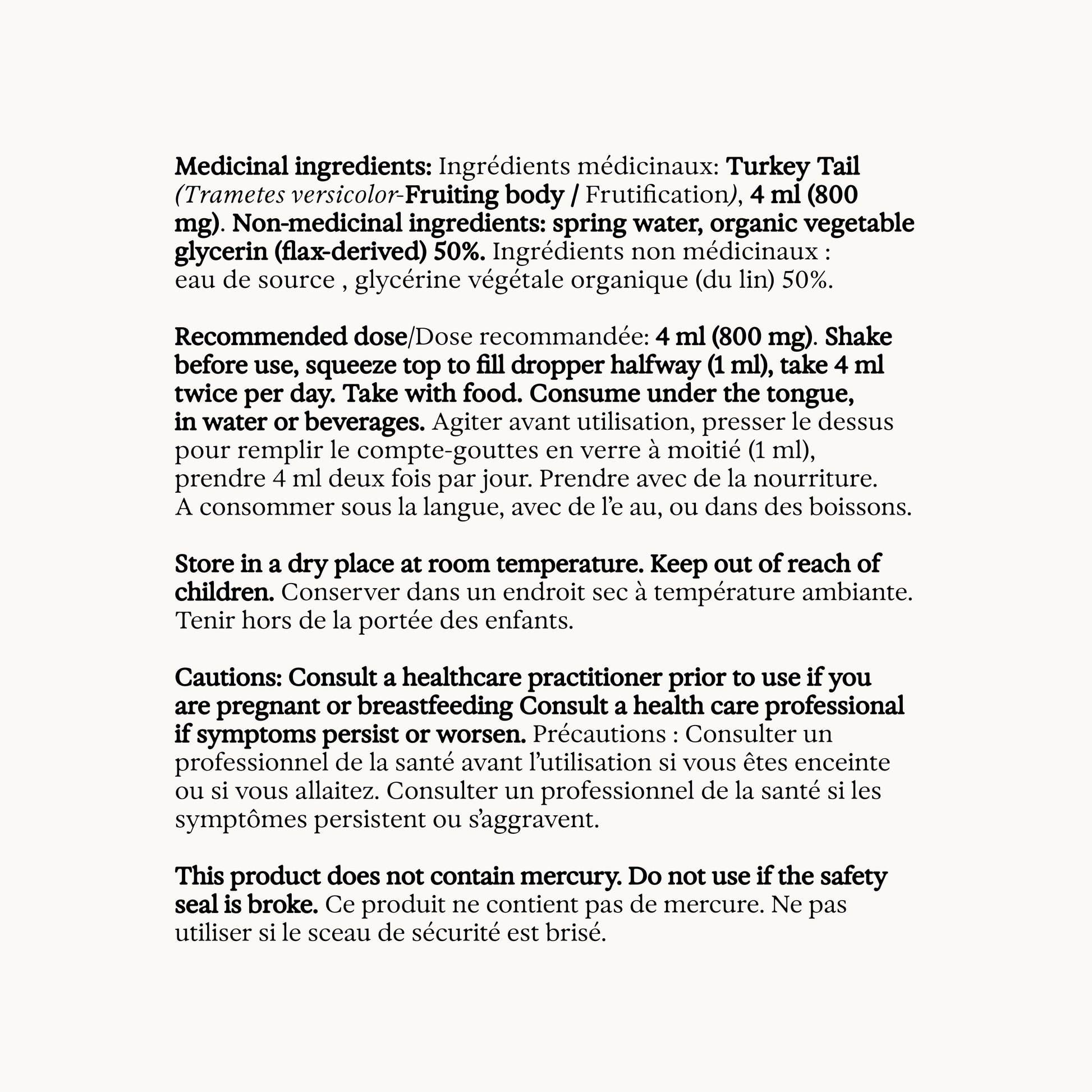 Turkey Tail is a glycerin-based, alcohol-free extract. Turkey Tail is the most widely researched functional mushroom, it is gut friendly and most renowned for its deep immunity support.