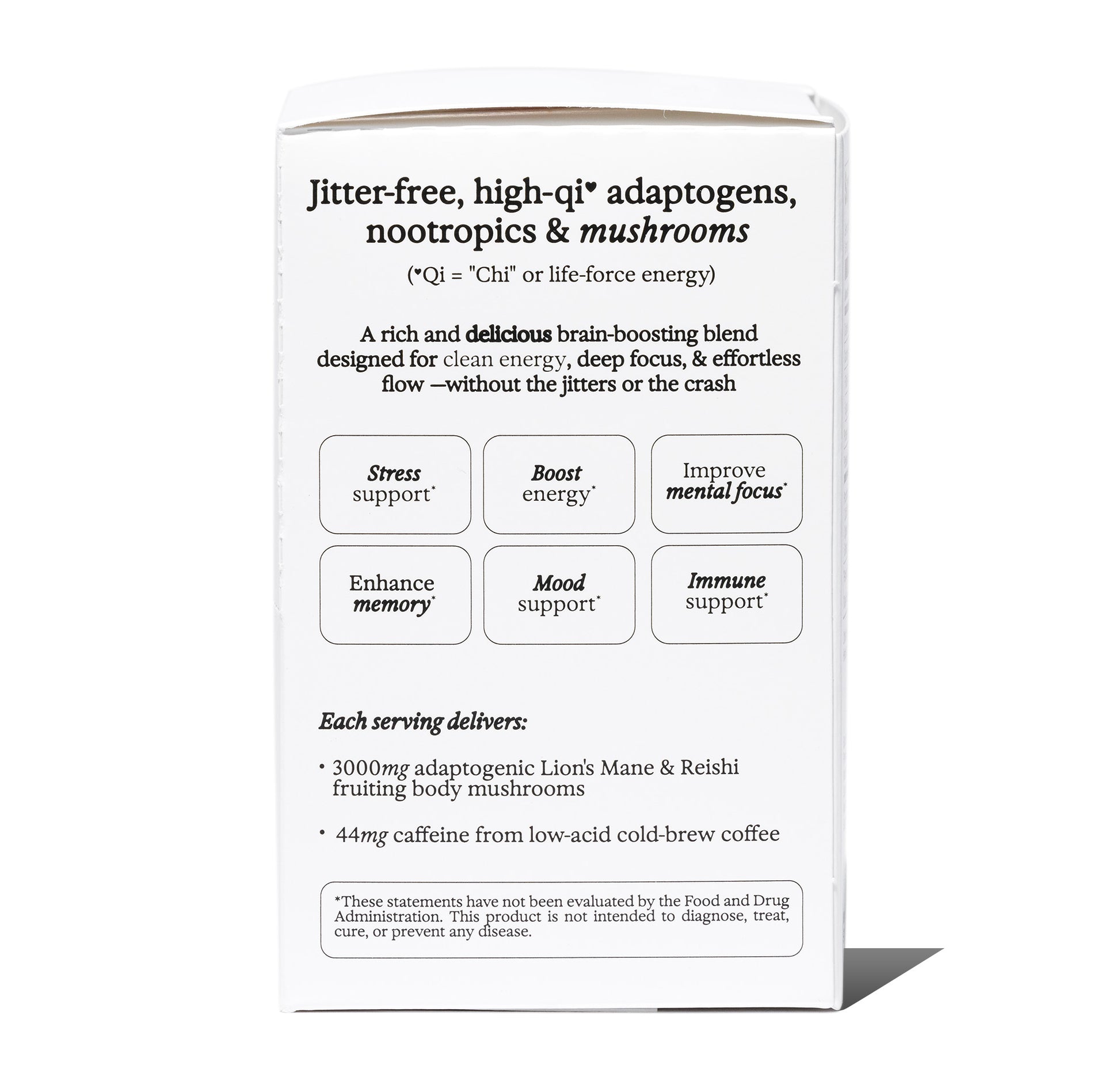 Fungki contains 44mg of caffeine per serving, making it a lighter, more balanced option compared to traditional coffee. Perfect for when you want focus and energy, without overdoing it on your nervous system.